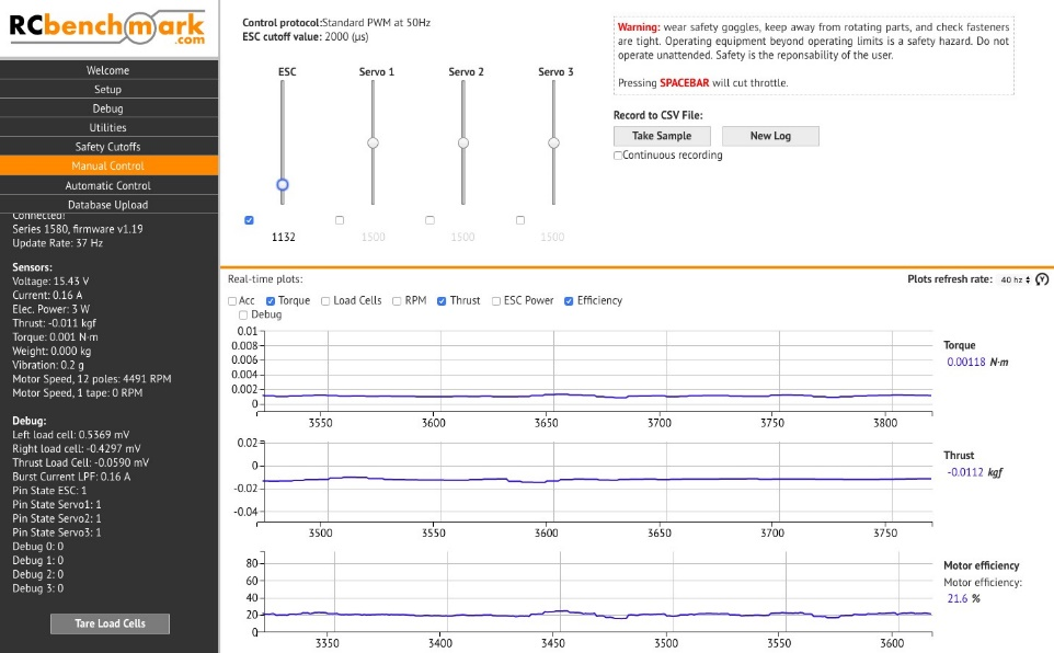 The Series 1580 Test Stand measures thrust, torque, RPM, current and voltage (Figure 2). System efficiency values are automatically calculated after the test is completed and additional sensors can be added to measure temperature and airspeed. The stand is controlled with the RCbenchmark Software that allows you to control your ECS's throttle directly from the GUI and view your recorded data live. Your tests allow you to collect important information about propeller and motor efficiency as well as consumed power.
